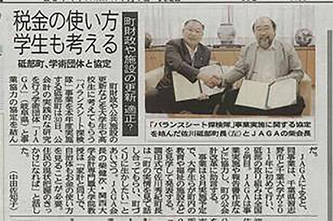 JAGA(柴健次会長)は、6月30日(月)に愛媛県砥部町役場において、砥部町(佐川秀紀町長)との間で、砥部町バランスシート探検隊事業に関する協定を取り交わした。同町は習志野市が千葉大学と連携して実施しているバランスシート探検隊に関心を示され、全国2番目となるこの事業展開を決断されました。JAGAの大塚成男理事と宮澤正泰理事が本事業を具体的に支援し、8月18日から20日にかけて探検隊事業を実施することになっています。町長との調印式には記者会見も行われ、翌1日の愛媛新聞で大きく取り上げられたところであります。